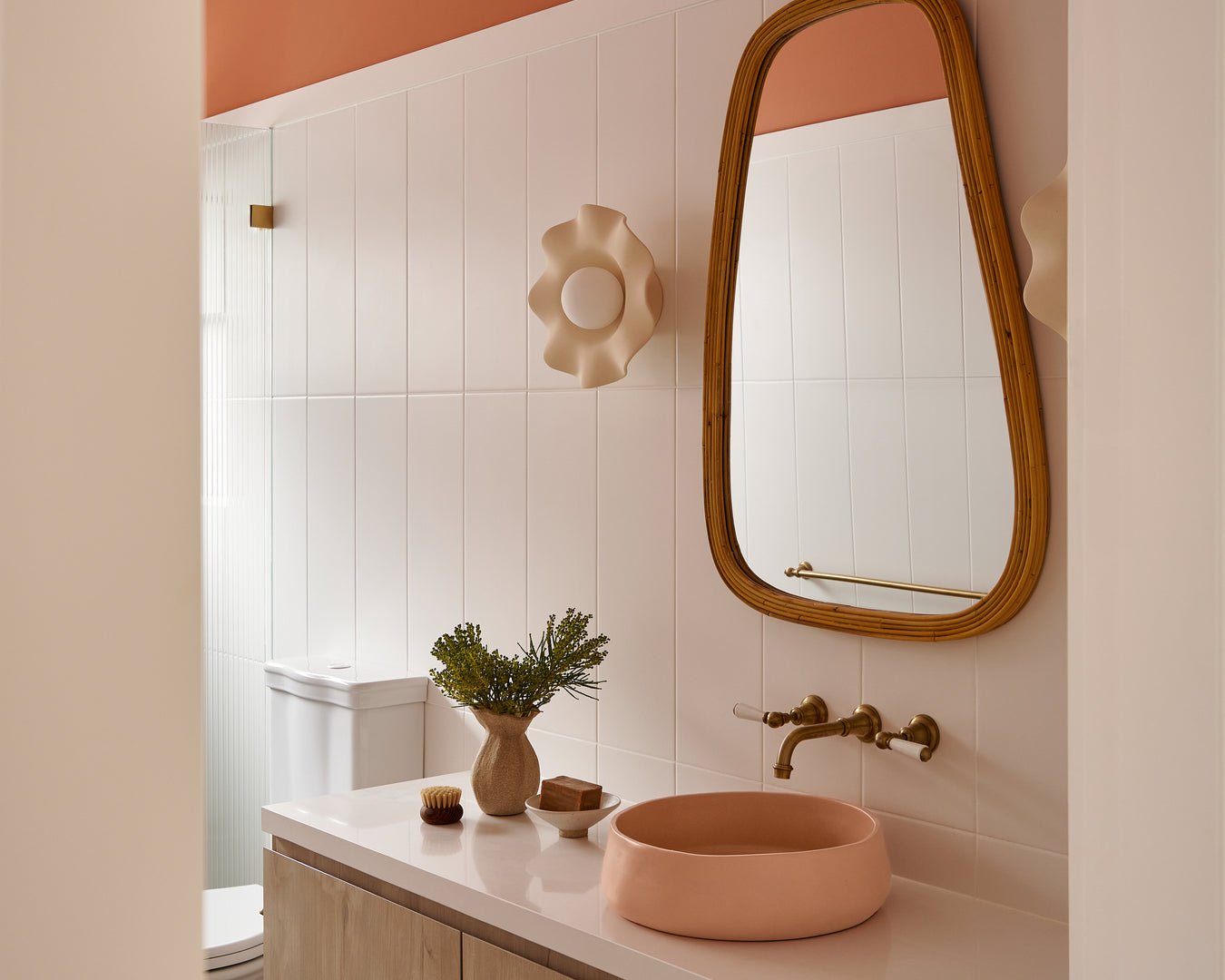 For Claire, one standout space is the ground floor bathroom, where the palette becomes its most expressive: peach-toned walls paired with the Mill Basin in Blush Pink. The result is playful, uplifting, and designed to make you smile the moment you step inside.