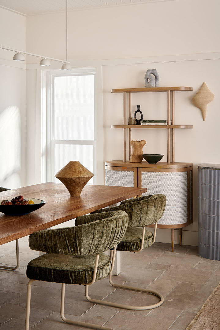 That’s why the home layers robust stone floors with soft rattan, playful colour with handmade-feeling joinery details, and durable finishes that can handle daily wear while still feeling special. Revel also leaned towards sustainable and Australian-made selections where possible.